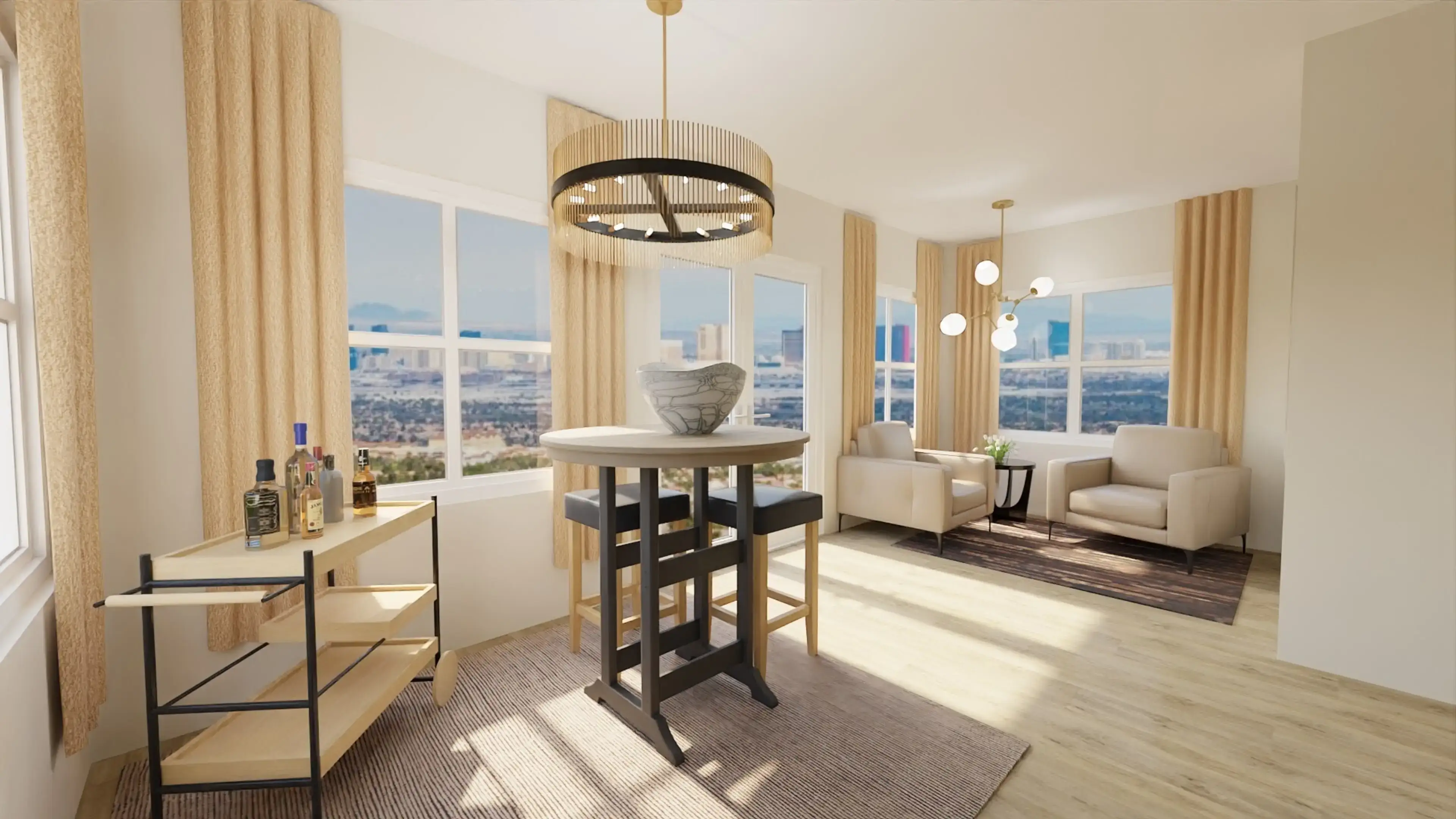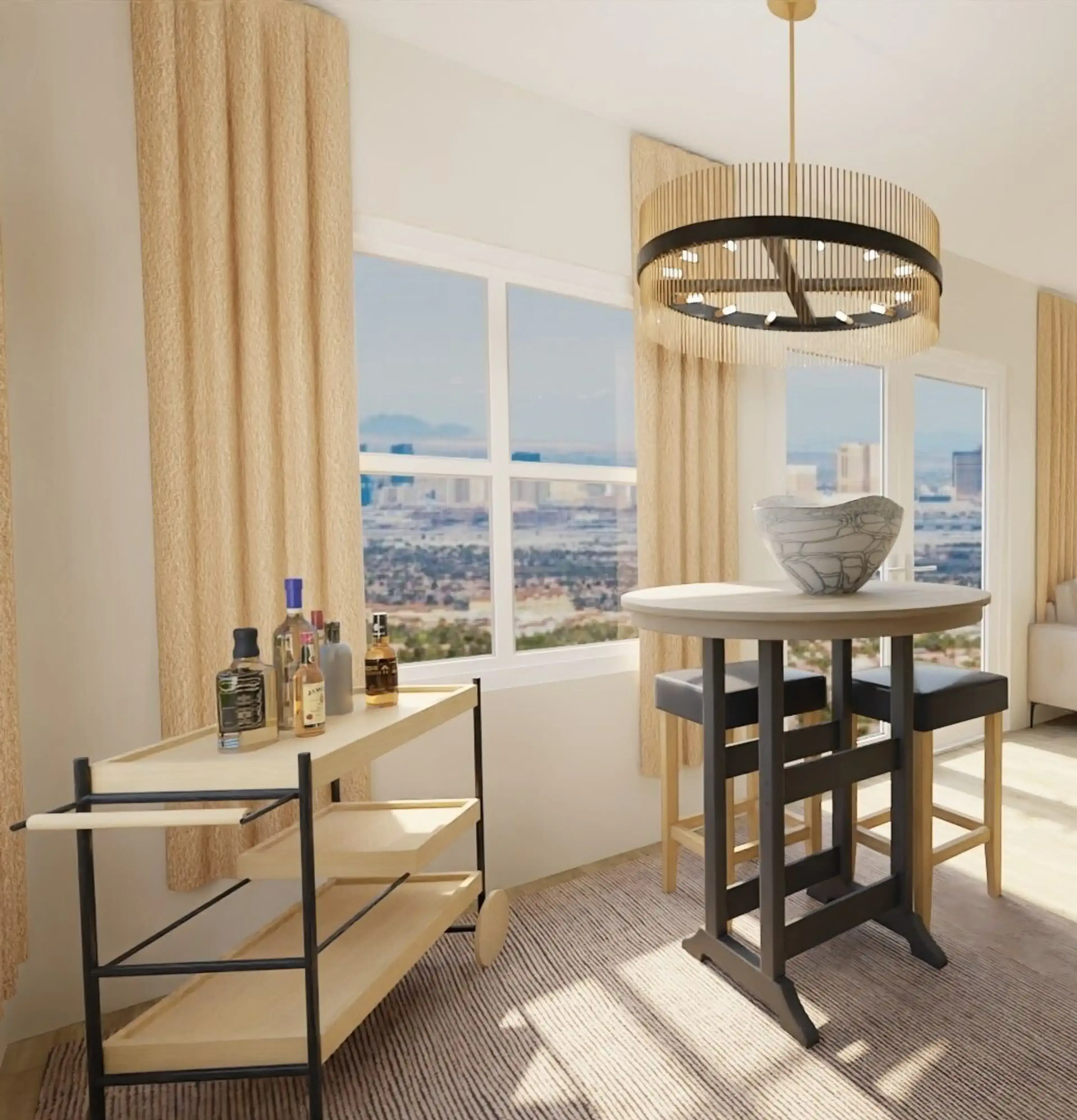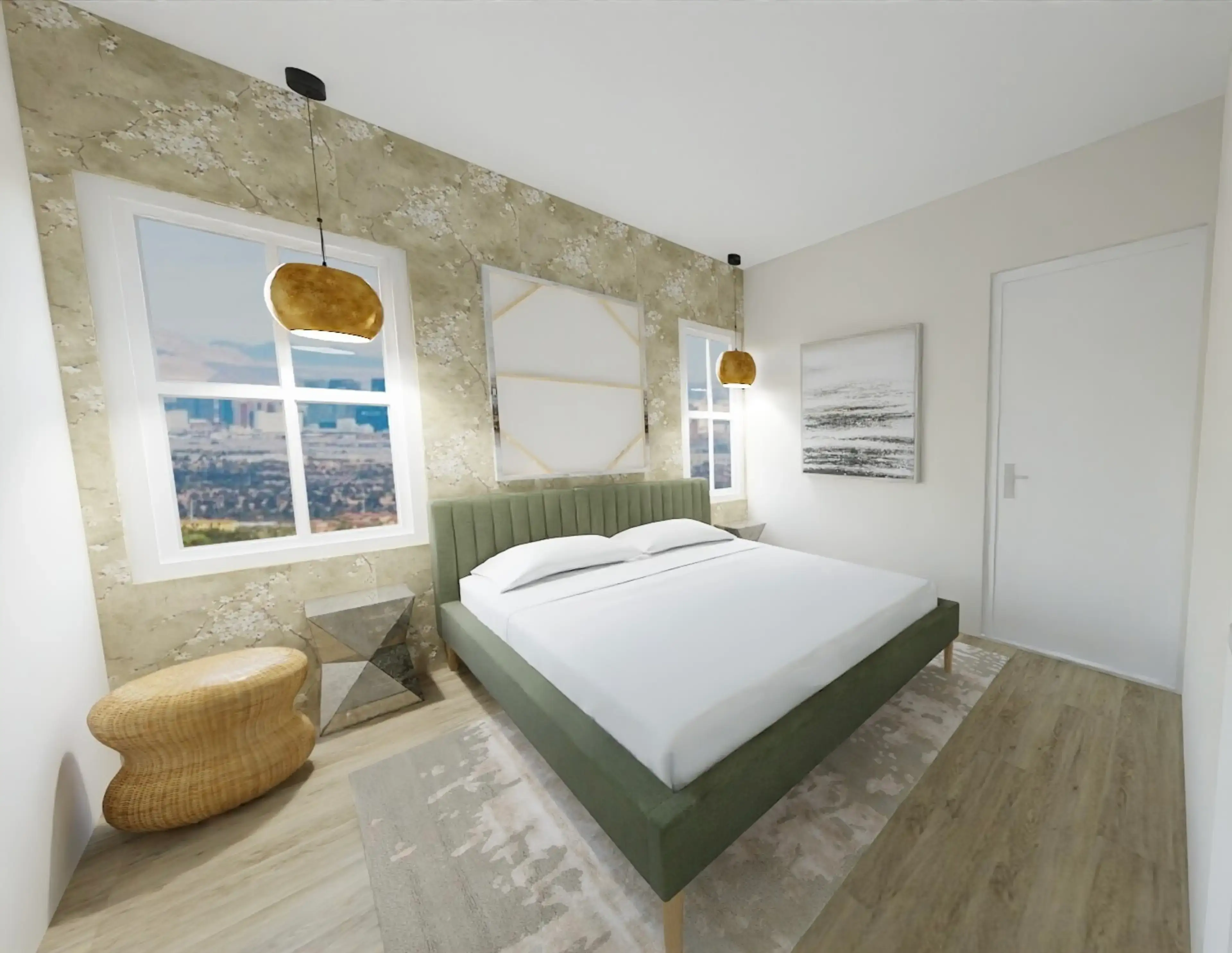 This is a Hall of Fame studio winning project. It is a conceptual full design project for a condo in Henderson, Nevada. With the client's choice of a green color palette, I focused on the full space planning, product selection, and material finishes.